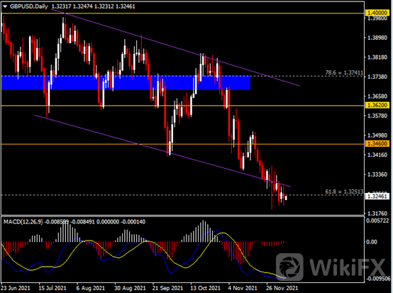 日线图显示英镑兑美元震荡下跌,当前测试1.3250支撑。从MACD来看,快慢线欲形成金叉,红色动能柱温和收缩。汇价走势和动能柱的变化呈分歧。