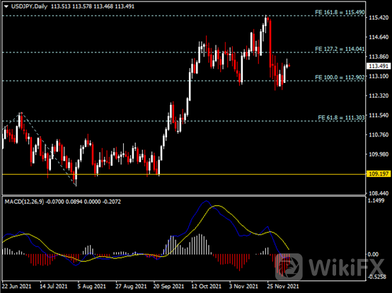 日线图显示美元兑日元震荡上涨,当前企稳于113.00支撑。从MACD来看,快慢线呈拐向,红色动能柱温和收缩。汇价走势基本和动能柱的变化一致。