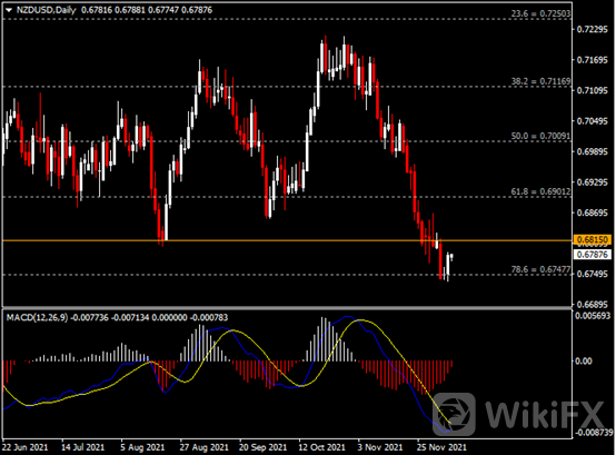 日线图显示纽元兑美元低位反弹,当前收于0.6750支撑。从MACD来看,快慢线呈拐向,红色动能柱逐渐收敛。汇价走势基本和动能柱的变化一致。