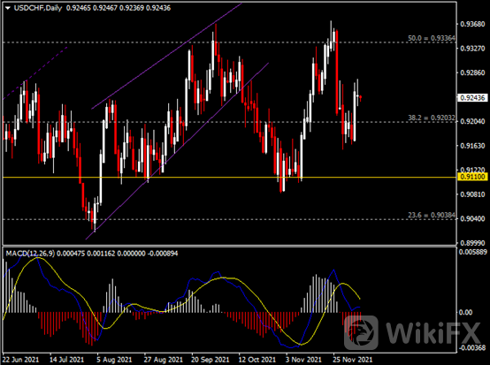 日线图显示美元兑瑞郎强势反弹,当前收于前高0.9200。从MACD来看,快慢线呈拐向,红色动能柱温和收缩。汇价走势基本和动能柱的变化一致。