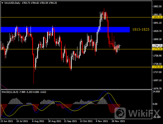 日线图显示金价低位反弹,当前收于1775支撑。从MACD来看,快慢线呈拐向,红色动能柱温和收缩。金价走势基本和动能柱的变化一致。