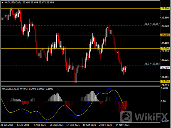 日线图显示银价小幅收涨,当前仍承压于22.65阻力。从MACD来看,快慢线呈怪想,红色动能柱温和收敛。银价走势基本和动能柱的变化一致。