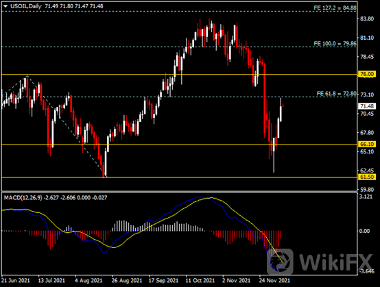 随着对Omicron病毒的担忧降温,油市近期重新吸引了多头并推高价格。截至昨日收盘,美原油录得最高72.66美元,较本月初的低点上涨了逾16%;布伦特原油亦从近期低点反弹逾14%至75美元水平。