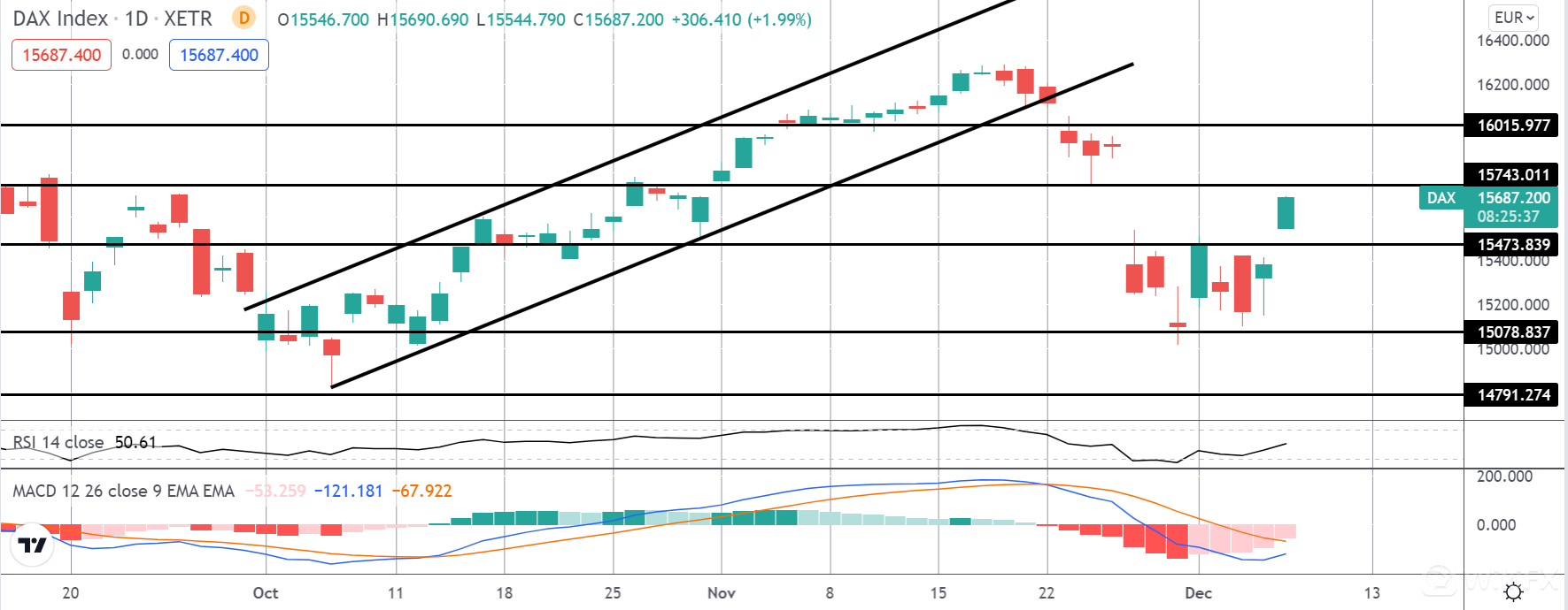 从 15078.83 水平反转走高,价格突破 15473.83 水平。随着 MACD 和 RSI 走高,接下来的重点是突破 15743.01 的水平,之后目标是升至 16015.97。