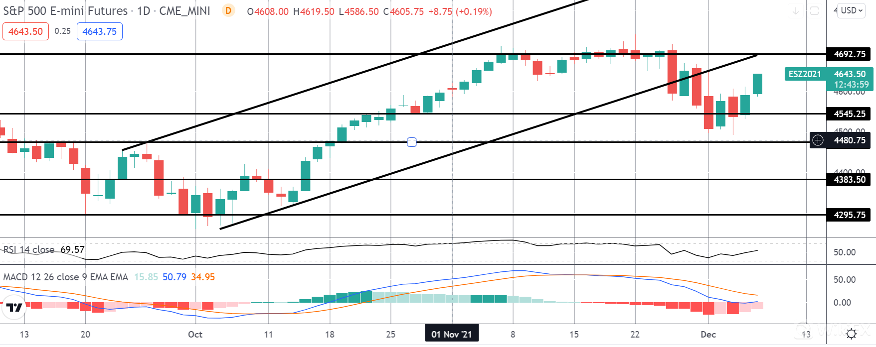 在测试低于 4545.25 水平后,标准普尔指数此后反弹走高,现在正快速接近重新测试突破的牛市通道以及 692.75 水平附近的结构阻力。 MACD 和 RSI 均走高,焦点是短期内继续走高。