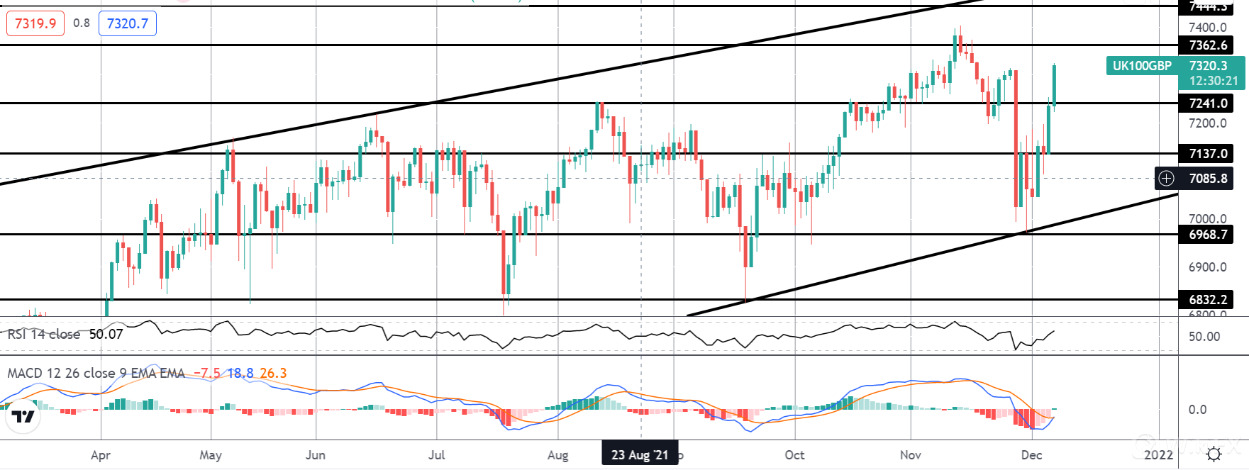 富时指数在这四家中看到了最显着的情绪转变,价格从 6868.7 的水平大幅反弹,回升至 7137 和 7241 的水平。 价格目前正快速逼近 7362.6 水平,MACD 和 RSI 也走高,关注近期进一步上行。