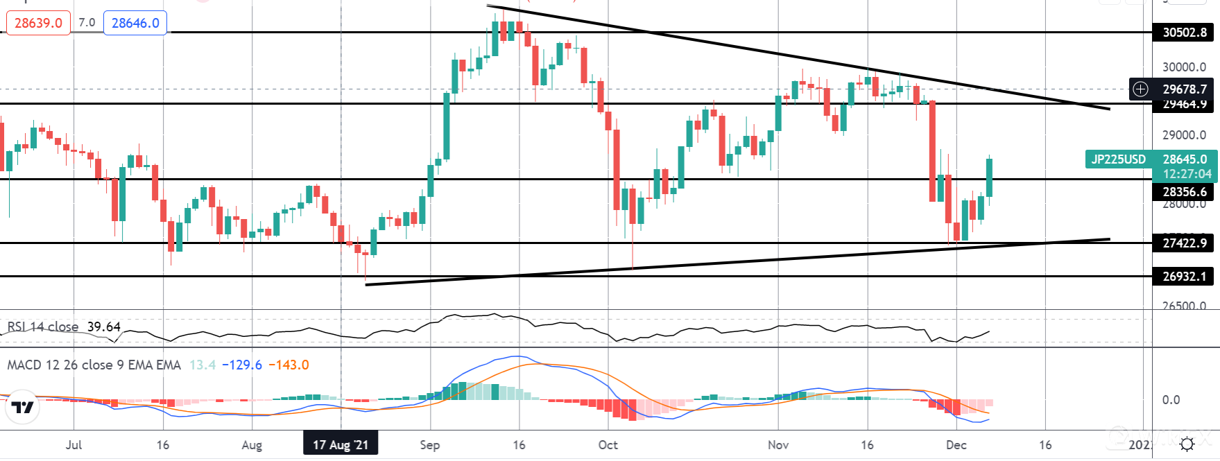 日经指数在大的收缩三角形模式中走高,该模式构成了过去两个季度的走势。 对 27422.9 水平的测试已经看到价格回升至 28356.6 水平上方。 在此上方,随着 MACD 和 RSI 走高,接下来的重点是测试 29464.9 水平和三角形顶部。