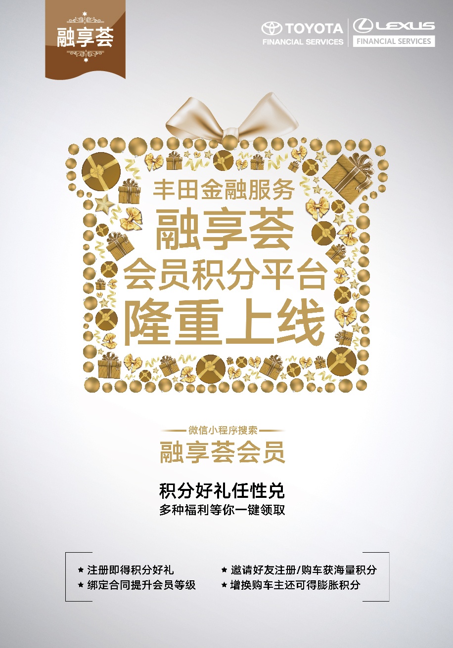 丰田金融服务融享荟会员积分平台包括:会员专享权益、积分福利及更多增值服务,如原厂汽车精品、消费类卡券,经销店消费券、维修保养抵扣券、违约金免除等。平台根据用户合同金额划分用户专属等级,随着等级的提升,不同的权益、积分兑换等多项福利和优惠也会不断升级。为每一位用户送出福利,让每一笔交易都能积累成长,从而实现以积分服务用户、以权益回馈用户的良好循环,通过最大化发挥用心服务用户的行动。