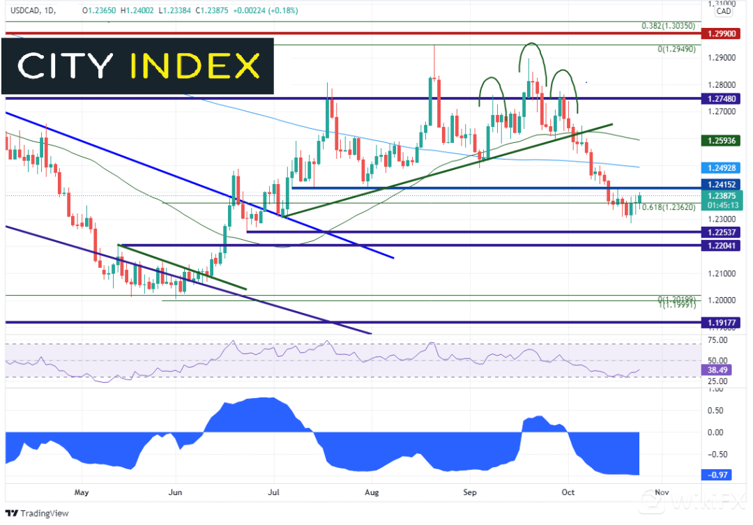 自从10月4日打破50天移动均线和头肩顶形态的颈线后,美元/加元不断走低,触及6月1日低点到8月20日高点行情的61.8%回档位,即1.2362附近之后于10月14日止跌。从那之后一直交投于1.2288-1.2410区间。下图底部的美元/加元和原油之间的相关系数显示,目前报在-0.97。-1.00表明完全负相关,-0.97已非常接近。所以,如果油价延续长期上涨势头,则美元/加元有可能重拾跌势。