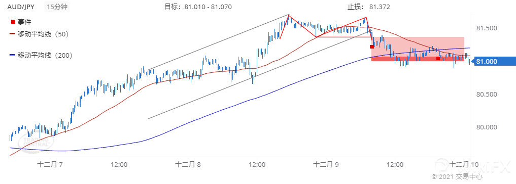 2021年 12月 09日(GMT时间08:00)我们在15分钟图表上发现称为双重顶的形态,确定了长达48小时在81.010到81.070范围内的目标价。