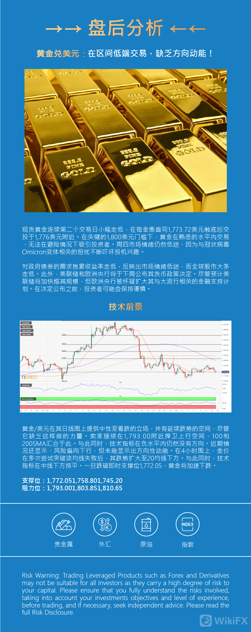 黄金兑美元在区间低端交易,缺乏方向动能!