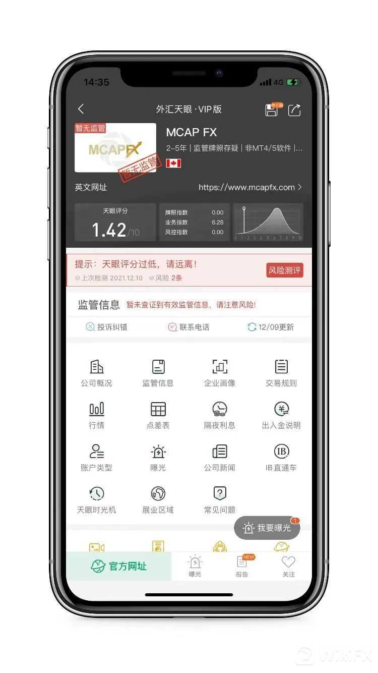 MCAP FX,天眼评分1.42分,其宣称持有的牌照被撤销后,当前暂无任何实际有效的监管牌照,存在巨大风险,建议投资者们远离。