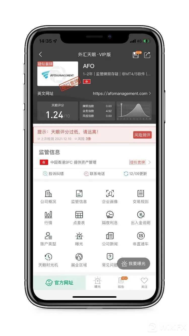 AFO,天眼评分1.24分,其宣称持有的牌照被撤销后,当前暂无任何实际有效的监管牌照,存在巨大风险,建议投资者们远离。