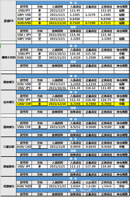 持仓方面,法农银行、路透IFR两投行仓位调整。法农银行加元兑瑞郎入场点位调整至0.7248,止盈点位调整至0.7800,止损点位调整至0.7050,目前处于持仓中。路透IFR澳元兑美元入场点位调整至0.7169,止盈点位调整至0.7290,止损点位调整至0.7115,目前处于持仓中。