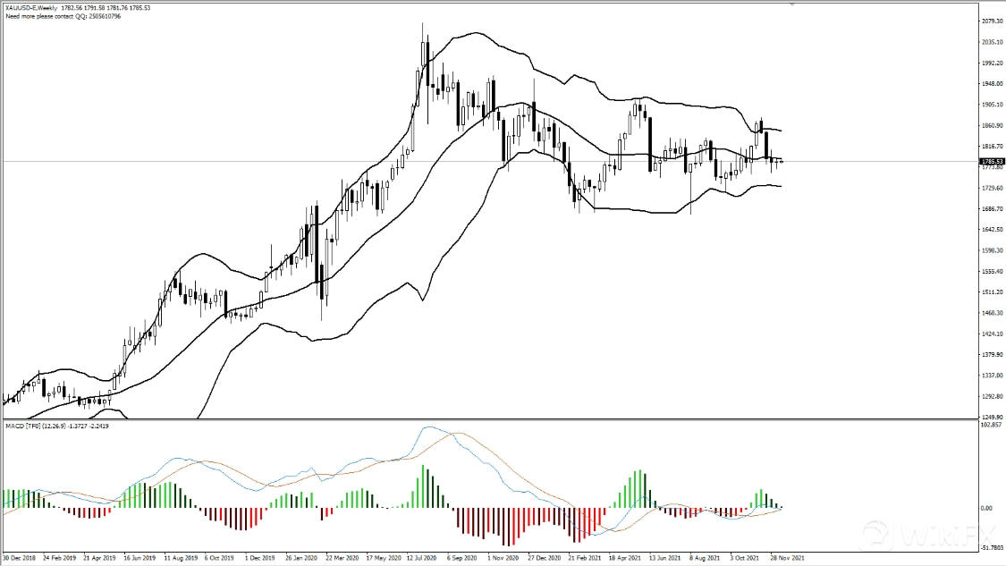 技术方面,今天我们用技术指标来进行分析判断。首先我们看周线的布林道通道,行情处于震荡布林带也走平。下方的辅助指标MACD双线也趋于0轴,这表示当前行情处于横向整理,且动力不强,短期方向不太明朗。