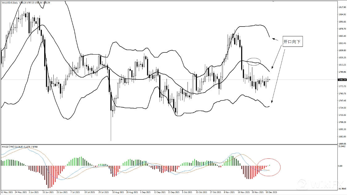 回到日线图表,布林带开口向下,MACD也处于0轴下方,这代表日线级别短期偏空,但是考虑到布林带斜率不大,所以向上的动力上可能会需要更多的市场消息进行辅助。另外MACD主线收缩,双线在日向形成金叉,也需要双线粘合到0轴附近,才会有技术动力。