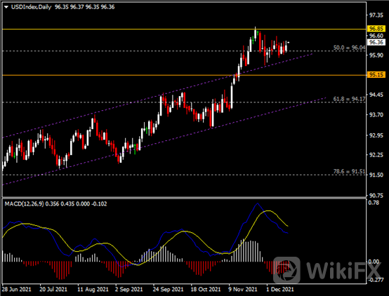 日线图显示美元指数温和收涨于96.00支撑。从MACD来看,快慢线向下运行,红色动能柱则温和收缩。指数走势基本和动能柱的变化一致。