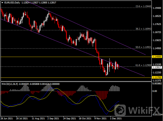 日线图显示欧元兑美元小幅下跌,当前承压于趋势线阻力和1.1300阻力。从MACD来看,快慢线向上运行,白色动能柱则略呈收敛。汇价走势基本和动能柱的变化一致。