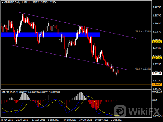 日线图显示英镑兑美元遇阻回落,当前承压于1.3250阻力。从MACD来看,快慢线金叉依旧,白色动能柱温和增量。汇价走势和动能柱的变化呈分歧。