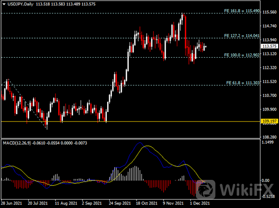 日线图显示美元兑日元小幅反弹,当前仍承压于114.00阻力。从MACD来看,快慢线欲形成金叉,红色动能柱逐渐收敛。汇价走势基本和动能柱的变化一致。
