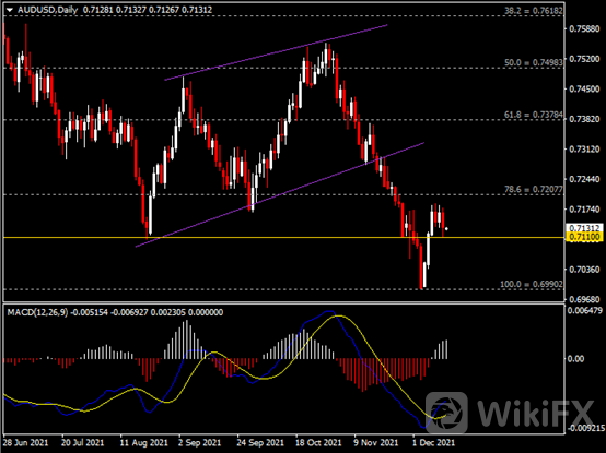日线图显示澳元兑美元回调下滑,当前仍收于0.7110支撑。从MACD来看,快慢线向上运行,白色动能柱温和增量。汇价走势和动能柱的变化呈分歧。