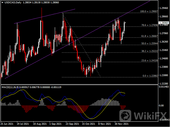 日线图显示美元兑加元扩大涨幅,当前收于前高1.2770。从MACD来看,快慢线呈拐向,红色动能柱温和收缩。汇价走势基本和动能柱的变化一致。