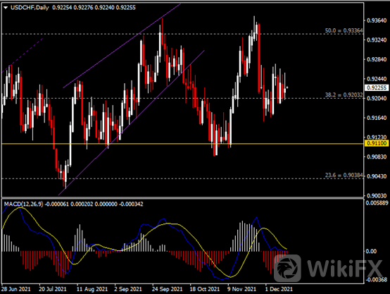日线图显示美元兑瑞郎持稳于0.9200支撑。从MACD来看,快慢线逐渐收窄,红色动能柱温和收缩。汇价走势基本和动能柱的变化一致。