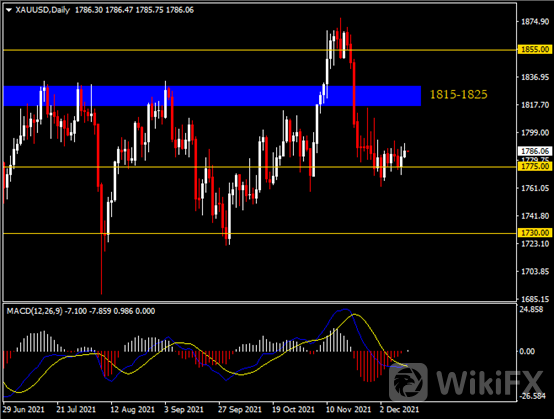 日线图显示金价温和收涨于1775支撑。从MACD来看,快慢线形成金叉,红色动能柱收缩殆尽。金价走势基本和动能柱的变化一致。