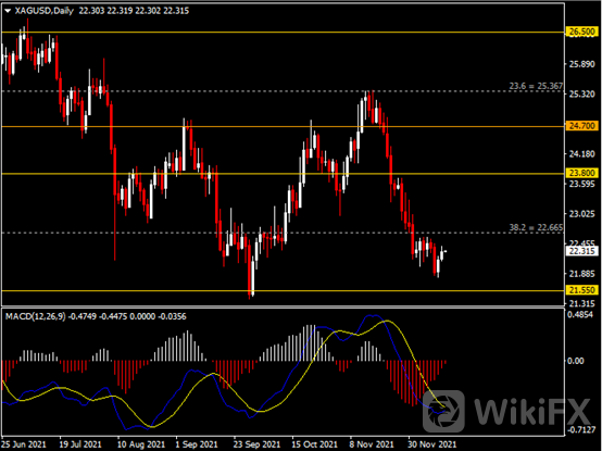 日线图显示银价反弹上行,当前仍承压于22.65阻力。从MACD来看,快慢线呈收窄,红色动能柱温和收缩。银价走势基本和动能柱的变化一致。