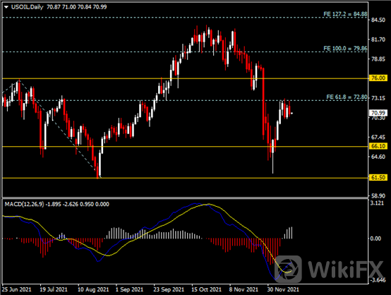 另外,本周的美联储FOMC也促使市场参与者保持谨慎基调。依据纽约联储的调查结果显示,美国消费者预期租金、医疗保健、食品、汽油、大学学费的价格涨幅将在未来一年平均超出9%。随着美联储主席鲍威尔摒弃了“暂时性”通胀的说法,经济学家认为该央行的立场将强势转鹰,预计从明年1月开始加速缩减购债,为300亿美元/月,直至3月结束。有者亦预期美联储在结束购债后,在明年加息两次、2023年加息3次以及2024年加息4次,最终利率将达到或接近2%。美联储转变鹰派有助于提振美元,而以美元计价的大宗商品如美原油则将承压。