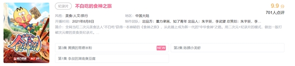 第二,深耕优质美食动画内容,不拘泥于内容本身,深度传播传统“吃”文化,让更多的人通过诙谐易懂的内容了解中国文化的博大精深。首部跨次元美食纪录片——《不白吃的食神之旅 》,让不白吃作为纪录片中的核心人物,带领观众品尝到中国各地美食,探访各地美食并深入背后故事,感受中华美食的魅力所在,总曝光量破亿,互动量超 300W ,在B站纪录片热门榜排第一 ,纪录片评分高达 9.9,评论区用户实现零差评。