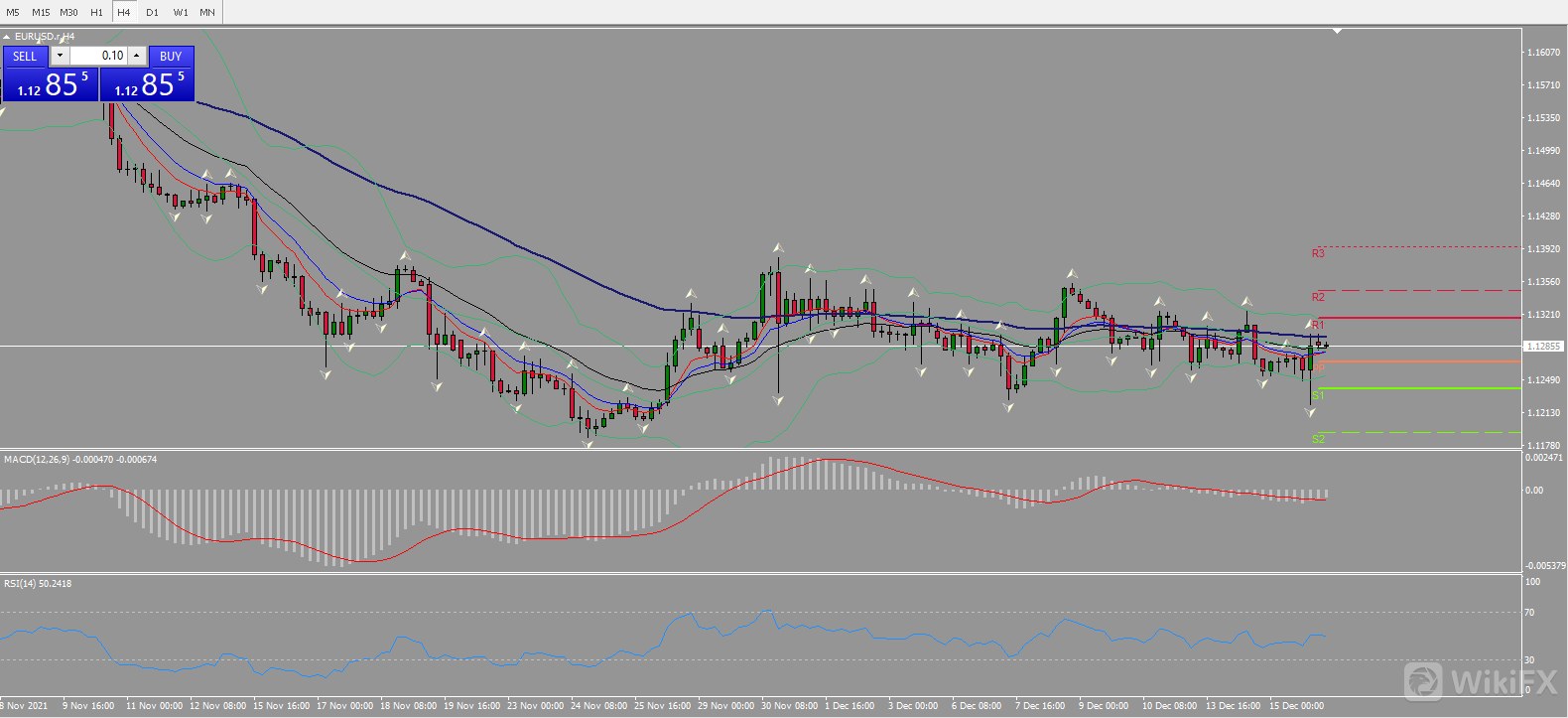 4小时图价格短期见底1.12217,RSI回调中值51,支撑位1.12389,阻力位1.13162。