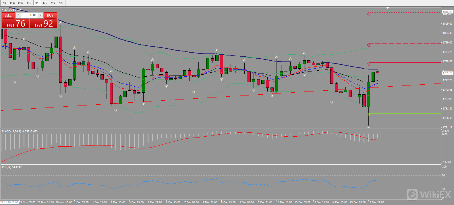 黄金价格在昨日美元指数冲高回落的情况下也出现较大波动,触底1752后继续反弹回之前的上升趋势线,目前维持在1781附近。整体黄金目前处于震荡区间,在美国加息确定,市场风险情绪上扬的情况下,黄金很难迎来进一步的买盘;而如果美国加息引发市场担忧,进而股市开始大幅回调的情况下,黄金则会迎来一般新的上涨。