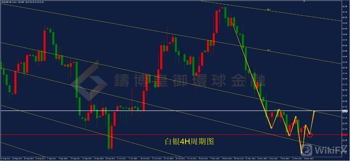 从下方白银4小时周期图看,白银目前处于回踩支撑后的反弹阶段,目前反弹力度较好,今日有机会延续反弹,从扇形线角度看上方压力在22.50一线,今日行情如有短线回踩可轻仓尝试参与反弹。中期看可观察22.50一线的压力情况,22.50一线如果破位,上方空间将会打开。