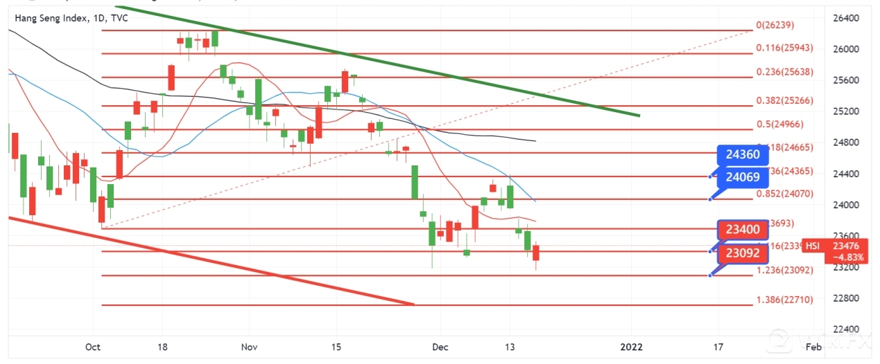无论如何, 投资者对美联储, 欧洲央行及英国央行货币政策指引, 对未来一季的央行升息压力暂时消失, 环球投资者继续追踪风险资产以抗持续高企的通胀, 部份资金从债市重投至股票市场。作为亚洲金融市场之一而且是中国股票市场大门的港股, 受到资金买盘流入, 恒生指数得以稳定跌势, 在最后年底最后的半个月, 相信有基金机构会在传统「粉饰」资产下推升港股。而恒生指数可否重遇24000突破20日均线(蓝线), 当然需要观察美国及中国监管机构对新经济科技股和金融业的监管情况。若有任何「减辣」的调控消息, 恒生指数可望完全收复近期跌幅, 上探50日均线(黑线)。