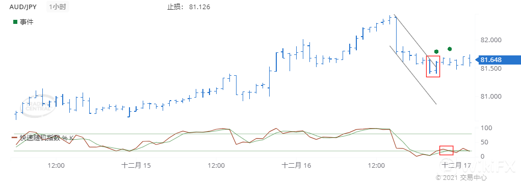 当%K线向上穿越%D线时,2021年 12月 16日(GMT时间23:00)针对快速随机指标的利好事件触发。交易的收盘价接近于最近最高-最低价格范围的较高端,这与价格上涨有关。