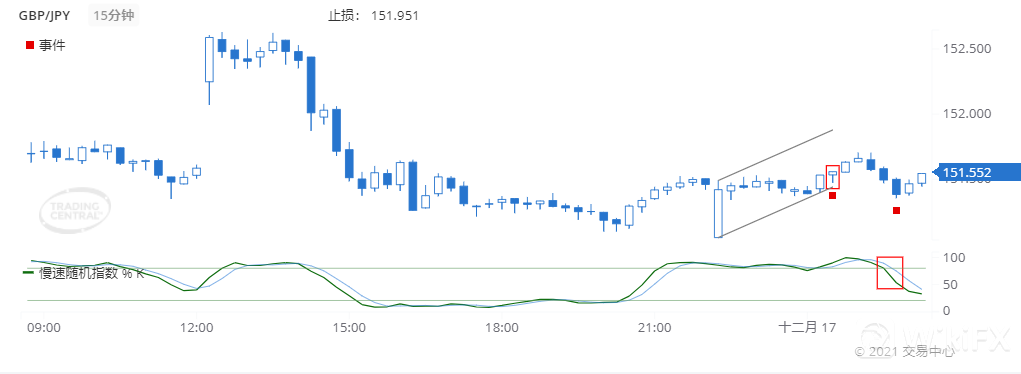 当%K线向下穿越%D线时,2021年 12月 17日(GMT时间01:45)针对慢速随机指标的利空事件触发。交易的收盘价接近于最近最高-最低价格范围的较低端,这与价格下跌有关。
