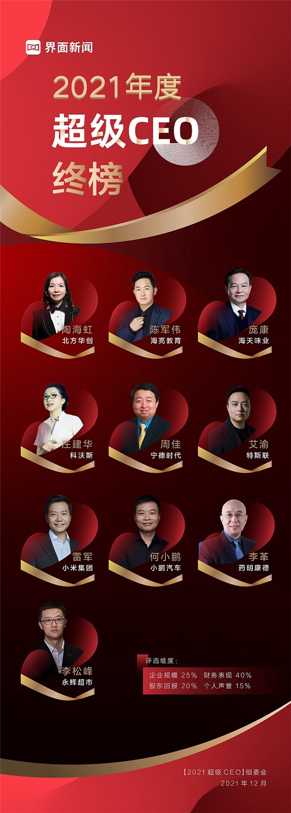 在经济环境与监管环境不断变化、行业竞争日益激烈的大背景下,入选「界面新闻2021年度超级CEO」榜单的10位CEO,有人抗住巨大压力,带领团队在激烈的行业竞争中激流勇进; 也有人在行业的颓势中,寻求逆风翻盘的机会;有人凭借独到眼光,领导企业把握时机加速转型;也有人稳借东风,带领公司乘势而。每一位都表现亮眼,展现出非凡的专业性与领导力,和公司一起创造出了卓越的业绩。界面新闻年度超级CEO榜单为您揭晓。