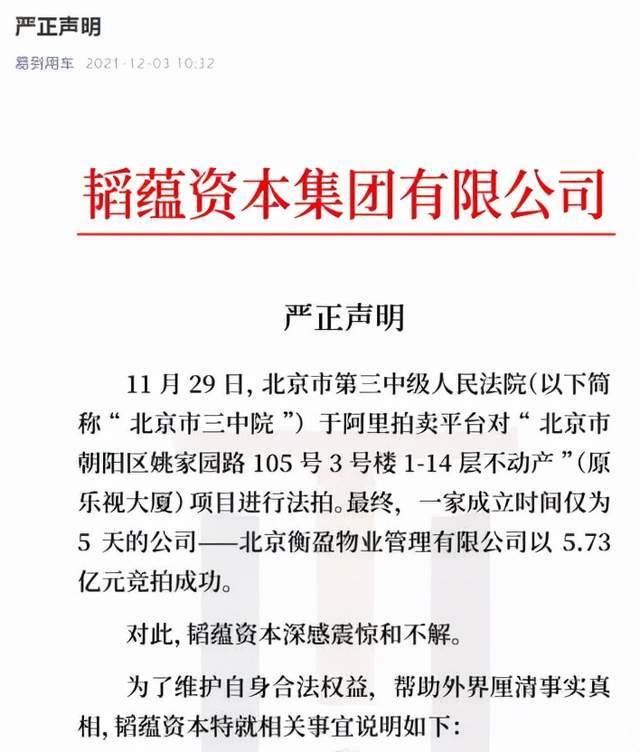 12月3日上午,韬蕴资本发布声明,对拍卖提出质疑,矛头直指竞买人背后的中植系。
