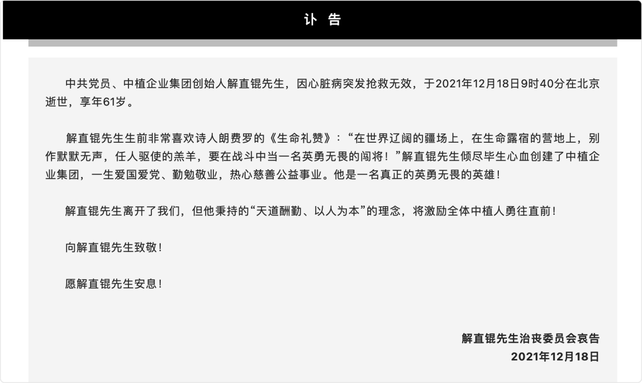 18日晚,中植企业集团官方发布的讣告确认了解直锟去世的事实。讣告中写到:中共党员、中植企业集团创始人解直锟先生,因心脏病突发抢救无效,于2021年12月18日9时40分在北京逝世,享年61岁。