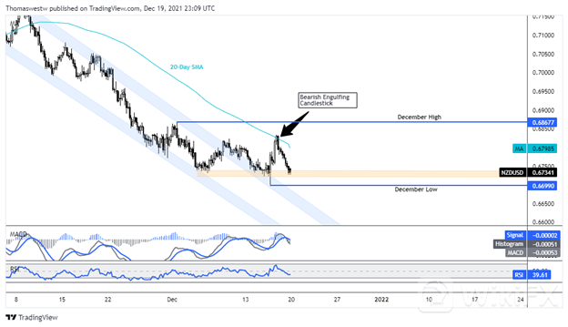 在上周看跌的吞没烛台导致价格走低后,纽元/美元交易于 12 月低点附近。 在此之前,本月早些时候价格突破了通道阻力。 如果当前支撑被打破,12 月低点 0.6699 仍处于危险之中,这可能为价格回落至通道阻力位和支撑位打开大门。 反弹将使多头在测试 12 月高点之前,试图突破下跌的 20 天简单移动平均线(SMA)。