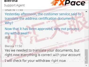 一开始FXPace客服先是跟倪先生不断进行地址确认,拖延了一段时间后才审核通过。再然后就是继续拖延了几个星期出金申请也没有被受理,询问客服得到的回答就是出金不归他们管。