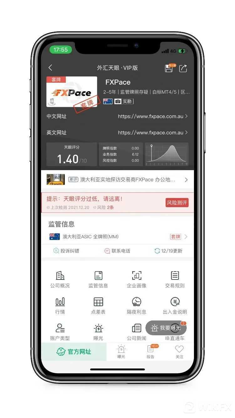 在外汇天眼上查询,FXPace天眼评分1.40分,宣称持有的澳大利亚ASIC全牌照套牌,当前暂无其他实际有效的监管牌照,其中该平台还拥有一条天眼实勘差评,实勘人员前往监管信息所示的办公大楼并没有找到FXPace的公司,存在巨大风险,建议投资者立即远离。