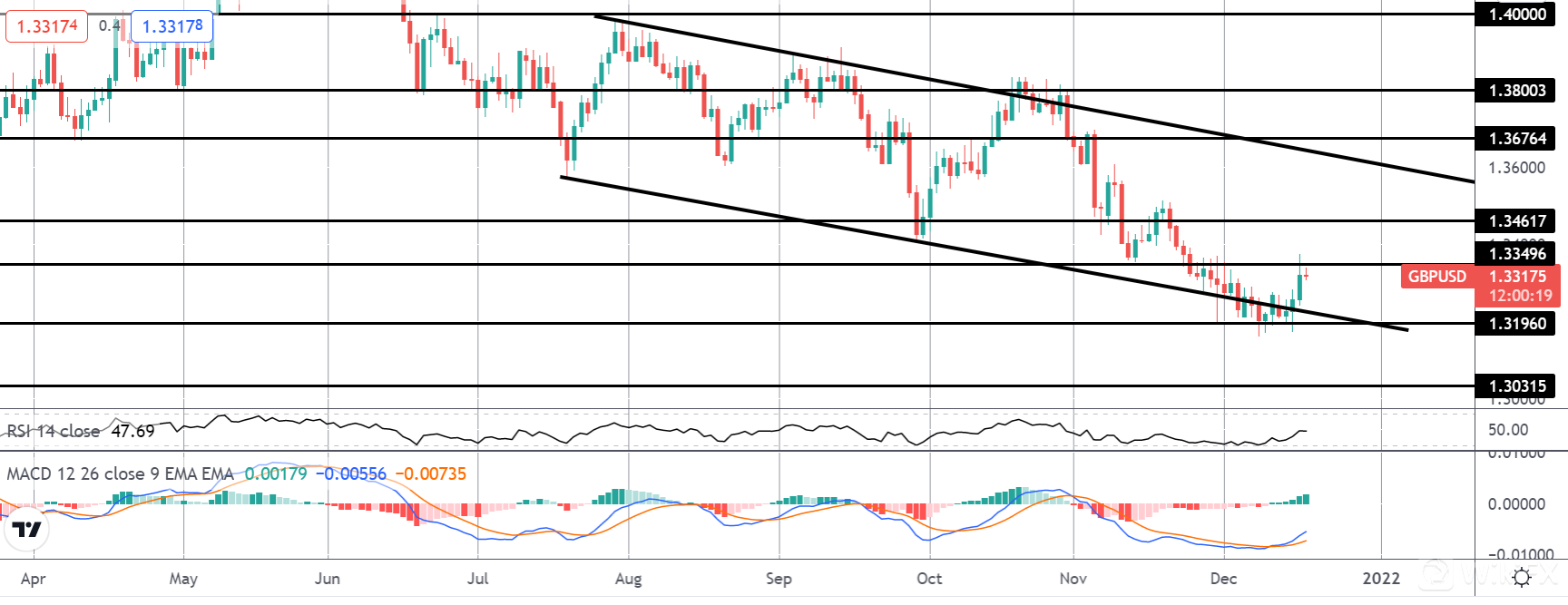 英镑兑美元的反应很好地代表了当前的动态。对 omicron 日益增长的担忧抑制了对该决定的最初看涨惊喜。目前,英镑兑美元已陷入对 1.3349 水平的测试(不是我一直在寻找的烟花)。鉴于熊市通道,虽然价格保持在下方,但重点是进一步下行。然而,在此上方,接下来的焦点转移到 1.3461 和上方的通道顶部。
