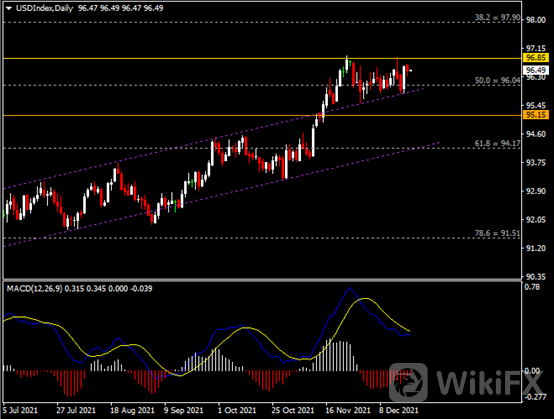 日线图显示美元指数小幅收跌,当前仍企稳于96.00支撑。从MACD来看,快慢线逐渐收窄,红色动能柱温和收缩。指数走势和动能柱的变化略有分歧。