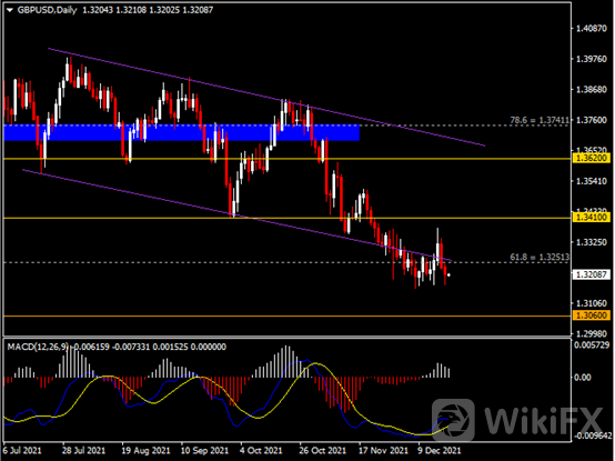 日线图显示英镑兑美元持续下跌,当前承压于1.3250阻力。从MACD来看,快慢线略呈拐向,白色动能柱温和收缩。汇价走势基本和动能柱的变化一致。
