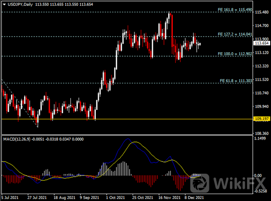 日线图显示美元兑日元跌势暂缓,当前仍承压于114.00阻力。从MACD来看,快慢线和动能柱呈平行。汇价走势基本和动能柱的变化一致。