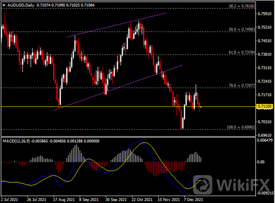 日线图显示澳元兑美元震荡下挫,当前测试0.7110支撑。从MACD来看,快慢线呈拐向,白色动能柱温和收敛。汇价走势基本和动能柱的变化一致。