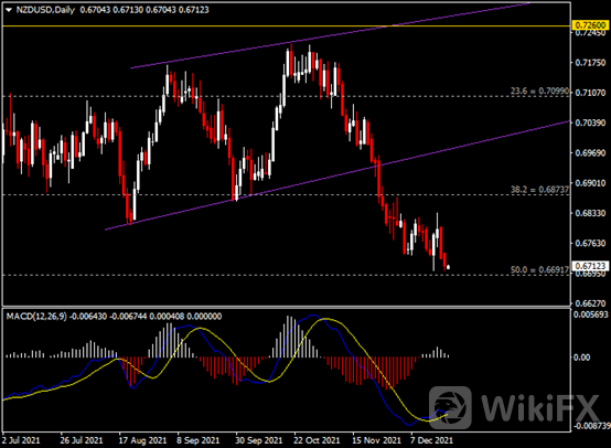 日线图显示纽元兑美元震荡下跌,当前逼近0.6700支撑。从MACD来看,快慢线欲形成死叉,白色动能柱逐渐收缩。汇价走势基本和动能柱的变化一致。
