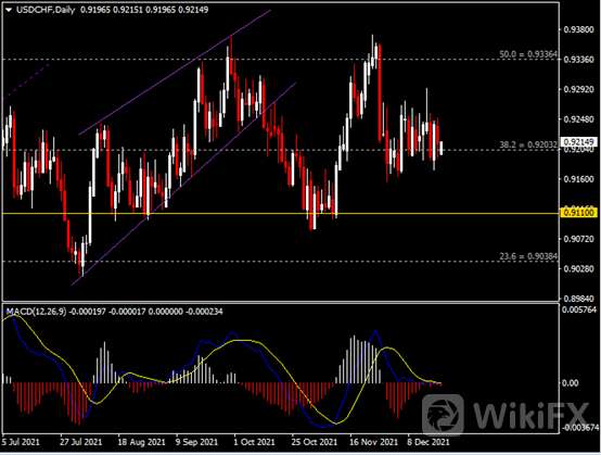日线图显示美元兑瑞郎保持区间震荡,当前走势不甚明朗。从MACD来看,快慢线拐形向下行,红色动能柱略恢复增量。汇价走势基本和动能柱的变化一致。